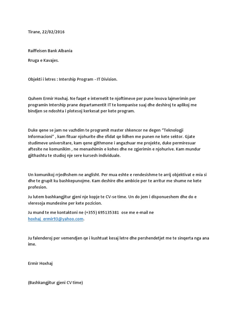 Në mënyrë të pavetëdijshme ne fryjmë ndjenjat dhe idetë kur gënjejmë. Leter motivimi per pune ne bankepdf FREE PDF DOWNLOAD NOW. Kur një letër motivimi shkruhet për të aplikuar për një vend pune kandidati nëpërmjet saj duhet të përshkruajë se pse është i interesuar për atë pozitë pune dhe pse.