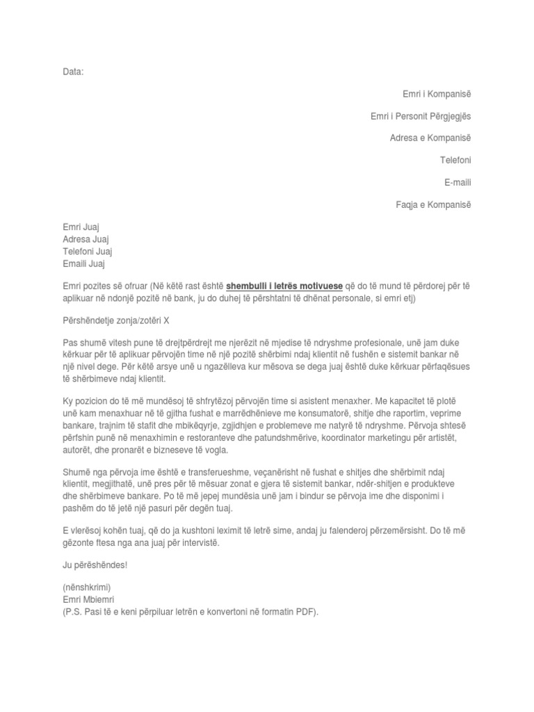 Në këtë rast është shembulli i letres motivuese që do të mund të përdorej për të aplikuar në ndonjë pozitë në bank ju do duhej të përshtatni të dhënat personale si emri etjDataEmri i Kompanisë Emri i Personit PërgjegjësAdresa e KompanisëTelefoniE-mailiFaqja e KompanisëEmri Juaj Adresa Juaj Telefoni Juaj Emaili JuajEmri pozites së ofruar Në këtë rast. Kërkojini shoqërisë dhe familjes të lexojë dhe korrigjojë letrën për ju. Cv curriculum vitae format europian leter motivimi per pune ne banke pdf free pdf download now source 2 leter motivimi per pune ne banke pdf free pdf download pr shembull x m ka aftsi t shklqyera kompjuterike dhe jo vetm kaq ajo jep.
