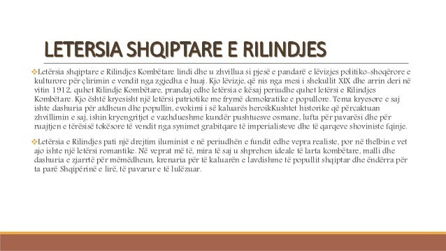 Letërsia shqiptare e Rilindjes Kombëtare lindi dhe u zhvillua si pjesë e pandarë e lëvizjes politiko-shoqërore e kulturore për çlirimin e vendit nga zgjedha e huaj. Gjysma e dytë e shekullit të XIV deri në shekullin e XVI. Ringjallja nacionale lëvrimi i shqipes si gjuhë e kulturës organizimi i arsimit kombëtar dhe themelimi i letërsisë kombëtare në rrafshin kulturor si dhe krijimi i shtetit të pavarur në rrafshin politik këto ishin pikat kyçe të programit të lëvizjes së Rilindjes prej së cilës lindi shkolla e romantizmit shqiptar të shek.