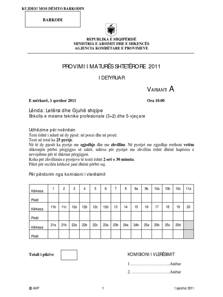 Teza e Letërsisë MSH 2012. Ky provim është publikuar pas mbarimit të procesit të provimit të maturës. AKP 1 1 qershor 2011 REPUBLIKA E SHQIPËRISË MINISTRIA E ARSIMIT DHE E SHKENCËS AGJENCIA KOMBËTARE E PROVIMEVE PROVIMI I MATURËS SHTETËRORE 2011 I DETYRUAR VARIANTI A E mërkurë 1 qershor 2011 Ora 1000 Lënda.