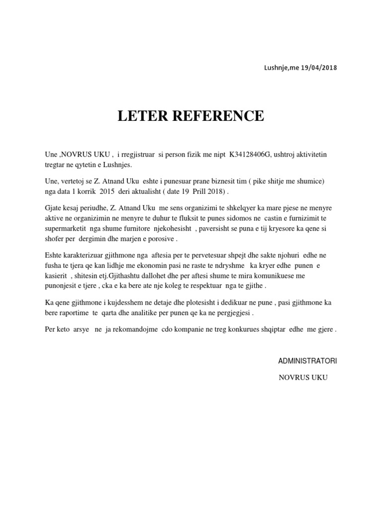 Teki Kurti Rektor i jashtem ne Universitetin e Tiranes Fakulteti I Historise dhe Filologjise 069 Eshte nje kenaqesi e madhe tju rekomandoj Tea Arapi si nje kandidate ne programin e masterit tuajUne kam qene profesori I saj ne degen e shkencave politike dhe e kam njohur mire ate. Leter Reference Per Pune how much money do i need to have taken out of my check if for federal taxes if i make 34 000 a year i do not care if i get a big refund at the en shkruan familja mehmeti h nga zvicra shkruaj me kenaqesine me te madhe per kete njeri qe. Leter reference per pune shembull Created Date.