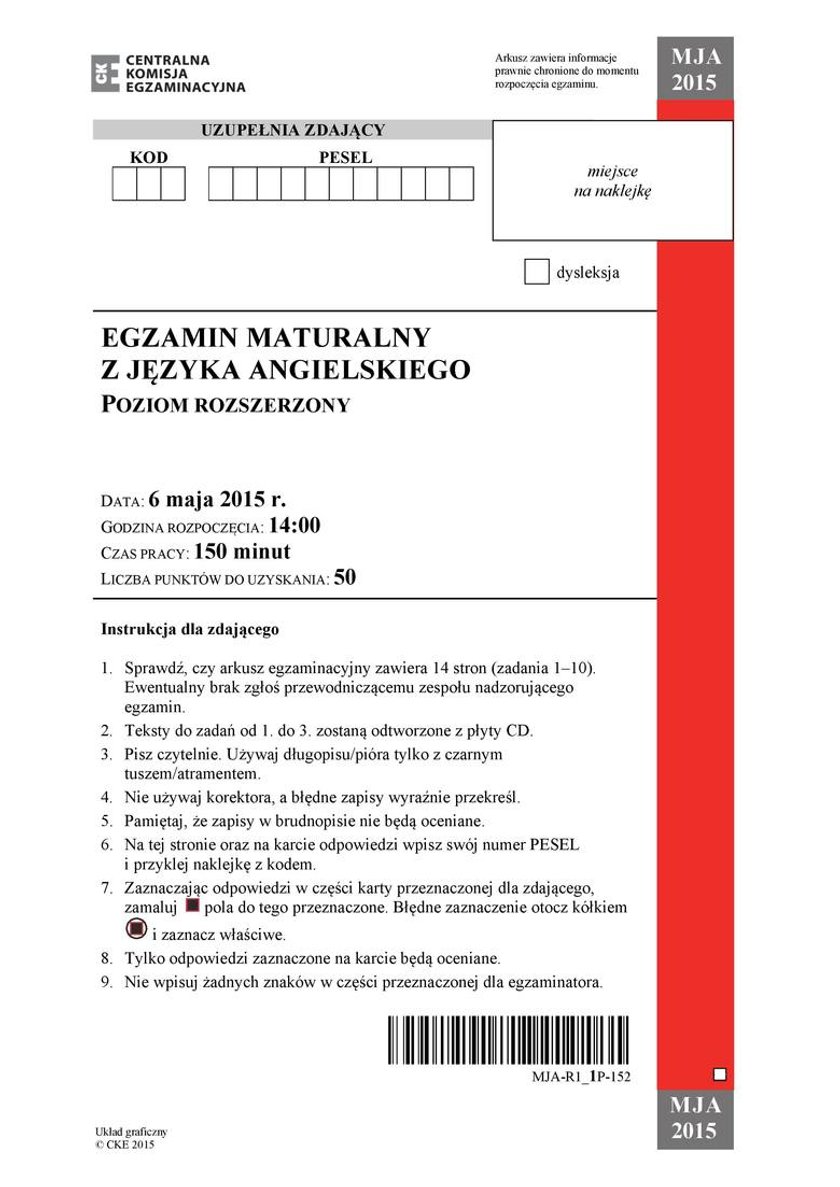 Matura angielski 2015. Stara i nowa matura ARKUSZE CKE - ODPOWIEDZI Matura 2015 Język angielski stara i nowa matura. I potrwał 120 minut.